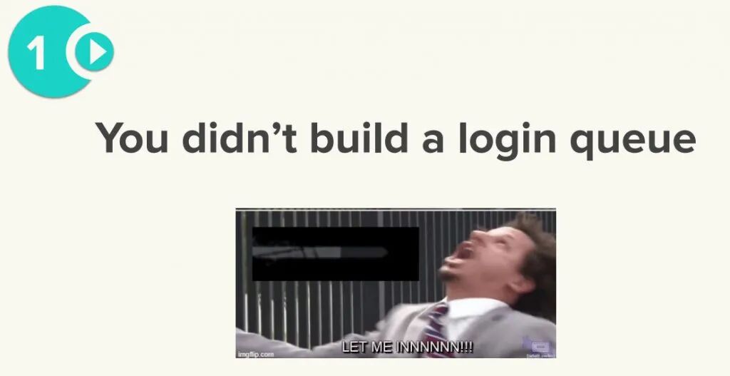 所以,如果你预计发布当天会迎来大量玩家,最好是做一个登录序列,以保证玩家的游戏体验。我们的目标是保护发布当天的顺利,所以就要给预测的用户量预备足够的支持,为此做一个登录序列,但这也带来了第二个问题。