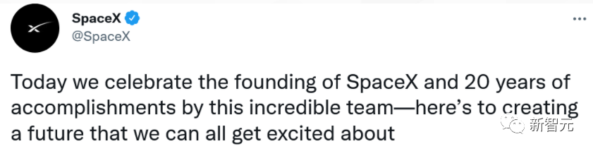 据悉,SpaceX成立于2002年3月14日,今年公司还举行了20周年庆祝仪式。「为创造一个我们都能感到兴奋的未来干杯。」SpaceX如此发推庆贺。