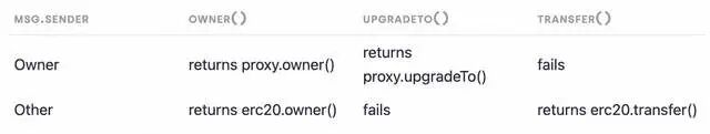 目前的最佳做法是根据调用的地址产生不同的行为。如果调用地址是代理所有者,那么它将永远不会委托调用逻辑合约。如果调用的合约不是代理所有者,它将是委托调用。