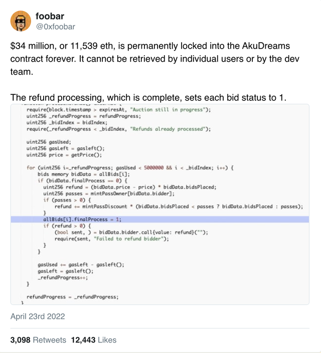 流行的NFT项目AkuDreams意外地将3400万美元的全部筹款永远锁定在一个智能合约中。我在这里写了一个推特线程,详细介绍了这个漏洞。