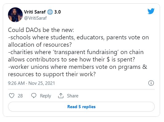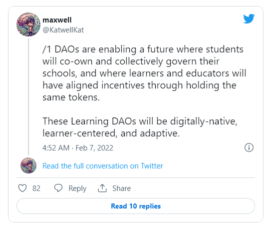 同样的概念也适用于 K-12 教育。DAO 可以作为接受世界各地学生的微型学校。学生可以为某一特定主题一起在线上学习。这对于没有机会接受教育,或是所在学校没有他们感兴趣课程的学生来说,是一个强有力的补充。