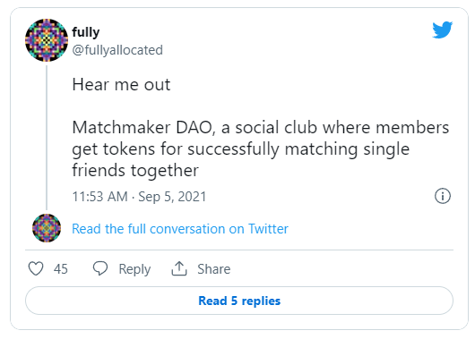 幸运的是, Qien 也为此找到了一个潜在的解决方案。DAO 可以促进约会和感情关系。“ DAO 可以为其成员建立配对的工具。他们还可以举办共同的聚会去混搭某些 DAO (例如 Flamingo x PleasrDAO ),类似一系列有助于认识更多人的兄弟会和姐妹会的混合聚会。”
