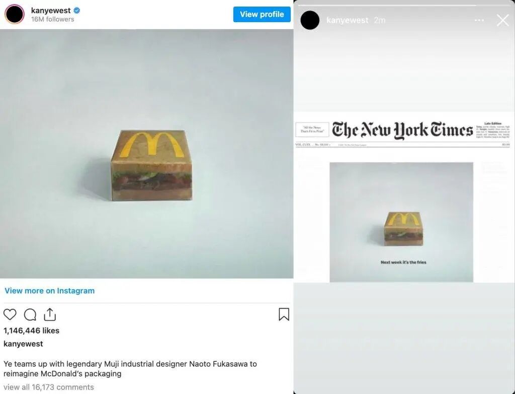 就在不久前,Ye(Kanye West ,坎耶·维斯特)在自己的 Instagram 上发布了一张照片,并写到他将与设计师 Naoto Fukasawa (深泽直人,无印良品设计师)合作,重新构想麦当劳的包装。在另一段 Instagram Stories(发布 24 小时后会自动消失的限时动态)里,除了汉堡的包装,还提到「next week it's the fries」。巧的是,这句话也曾在「侃爷」的歌词《Gold Digger》里出现过。「侃爷」和麦当劳合作,乍一看让人有些摸不着头脑,其实也算是意料之中。Ye 和麦当劳的缘分,其实并不只是这次的合作。在几个月前超级碗期间的麦当劳广告里,他就已经出过镜,坐在他那辆吸睛十足的 Sherp ATV 越野车上,在麦当劳的得来速窗口前,看着菜单犹豫不决。更早之前,还没改名为 Ye 的 Kanye West 就已经直接表达过自己对麦当劳的喜爱。比如 2018 年在推特的发言:「麦当劳是我最喜欢的餐厅」。2016 年的时候,在 Frank Ocean 推出的限量杂志《Boys Don't Cry》里,Kanye West 还「深情」赋诗一首——《The McDonald's Man》不仅诗的名字就相当直白,内容出现的也都是麦当劳的食物:炸薯条、芝士汉堡、奶昔、健怡可乐、苹果派……除了和麦当劳有不浅的渊源,与食品界的合作对于 Kanye West 这个「跨界狂魔」来说也并不稀奇,毕竟一开始作为说唱歌手崭露头角的他如今已经在多个领域都留下了自己的痕迹。不同于常见的「匪帮说唱」,无论是歌词的内容还是旋律的结构编排上, Kanye West 自成一派的音乐风格都在欧美 HipHop 音乐界独特的存在。拿到了二十几座格莱美奖杯的「侃爷」是业内不得不提的黑人歌手,也曾是 Jay-Z、麦当娜等众多大牌明星的音乐制作人。虽然在音乐上成就斐然,但许多人可能并没有听过他的歌。没听过歌不要紧,但不太可能没有见过他的设计。Kanye West 的个人潮流品牌 YEEZY ,有大名鼎鼎的「椰子鞋」,几年内火遍全球(那些年似乎在哪儿都能看见 Yeezy Boost 350 );也有大行「解构主义」的各类服饰(与金·卡戴珊未离婚时,每次出新品卡戴珊家族齐齐「带货」的场面也还记忆犹新)。不仅有自己风格独特的设计品牌,Kanye West 时尚界的影响还要更广。曾担任 LV男装艺术总监以及品牌 Off-White 主理人的 Virgil Abloh,是「侃爷」的好友,也曾是 Kanye 创意团队 Donda 的创意总监。Kanye West 与 Virgil Abloh ,图片来自:NSS MAGAZINE高端潮牌 Fear of God 的主理人 Jerry Lorenzo 也曾在「侃爷」的 Donda 团队里当过设计师(Kanye 也经常身着 Fear of God 的各类服饰)。Kanye West 与 Jerry Lorenzo ,图片来自:Pinterest沉迷设计的 Kanye West 除了在时尚界「大展拳脚」之外,在室内设计上的想法相当别致。曾经与金·卡戴珊在 Calabasas 共同生活过的豪宅,请来了比利时知名设计师 Axel Vervoordt。装修完的「豪宅」走的是与众不同的「赤贫风」,看起来似乎家徒四壁,但其实是精心设计的空间,大面积地使用黑白灰,践行极简风格,也融合了日式「侘寂」(宁静的氛围让这里仿佛是个修道院)。2018 年时,Kanye West 还在推特上宣布要打造「Yeezy Home」作为无家可归者的住处。说唱界的传奇,时尚界的制造者,住所的独特……音乐、鞋类、服装、室内设计……「侃爷」的生活极其丰富。尤其是这几年,他的想法也愈加「疯狂」和独特:想竞选美国总统;新出的专辑《Donda 2》,试听会现场当众「火烧房」,专辑也不登上任何一个流媒体平台,而是仅限于自己推出的一款售价 200 美元的 Stem Player 播放器。或许有些行为存在争议,成果也并不是那么如意。但不可否认的是,不断跨界又不断尝试的 Kanye West 用自己的力量与想法在当代流行文化里抹上了浓重的一笔又一笔。并没有系统学习或音乐的他,却把嘻哈乐的边界一再拓宽,将电子乐、爵士乐甚至是交响乐都融合在一起。脱离了地下音乐常见的表达主题,开始讨论社会、名利、亲情乃至宗教。虽然有些过于先锋的表达招来了非议,但这种独树一帜的风格,让地下音乐与主流音乐有了交融与碰撞,也让嘻哈乐的风格变得更多元。瞄准了设计的 Kanye,又带着 Yeezy 在时装周的秀场里走出了属于自己的「解构主义」。简约的设计与配色在时尚界是一种突破,他也凭着这份特别引领了新的潮流。有人说 Kanye 越来越「疯」,但或许正是这种对先锋和突破有些极致的追求,才让他在流行文化里掀起一次次浪潮。也许即将与无印良品设计师 Naoto Fukasawa(深泽直人)及麦当劳合作的计划里,又有能让人眼前一亮的「惊喜」。![]()