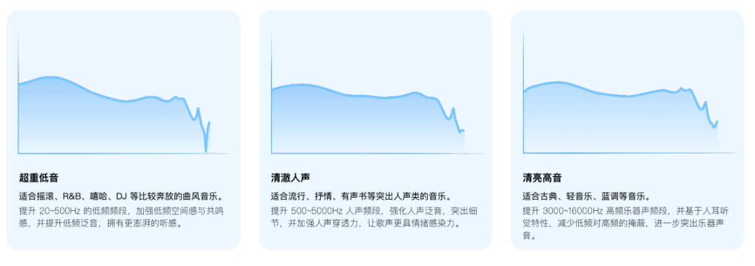 同时为了迎合不同用户的声音风格偏好,金耳朵团队还为其带来 DeepX 2.0 立体声效,包含「超重低音」、「清澈人声」、「清亮高音」三种不同的声音风格。