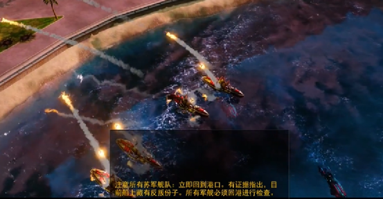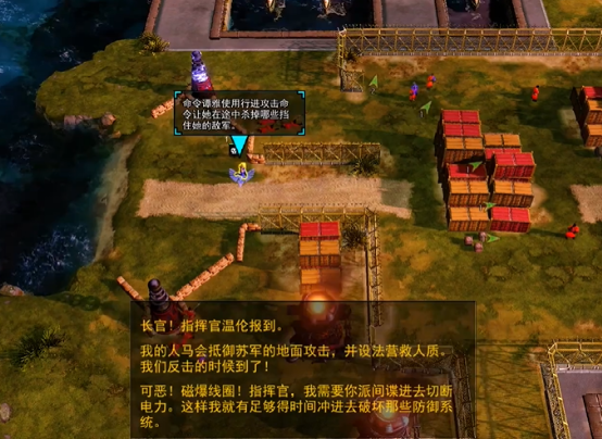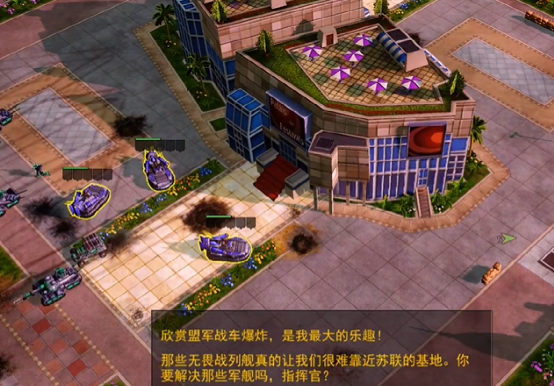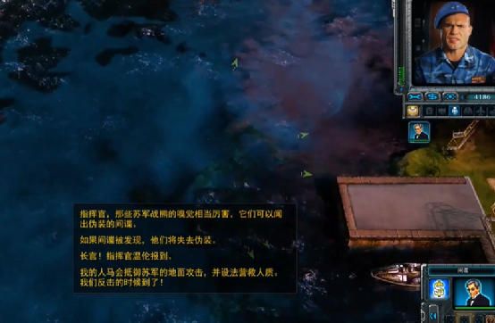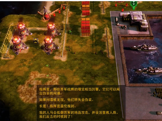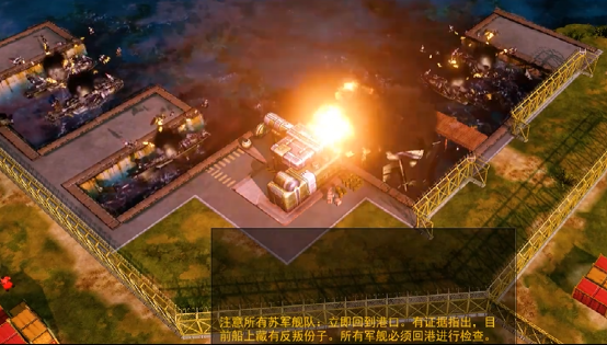 在谭雅与间谍们的配合下,突击小队成功打进了苏军港口基地内部,将几座重要的补给港口全部占领。间谍在占领补给港口后,给船坞都安上了炸弹,而谭雅则进入港口管理大楼,模仿俄语的口吻,用大喇叭诱骗所有的苏军舰队回到港口。![]()