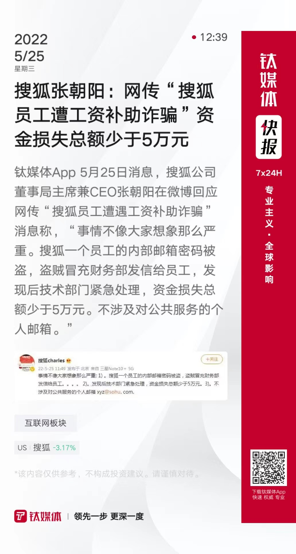 搜狐张朝阳:网传“搜狐员工遭工资补助诈骗”资金损失总额少于5万元
