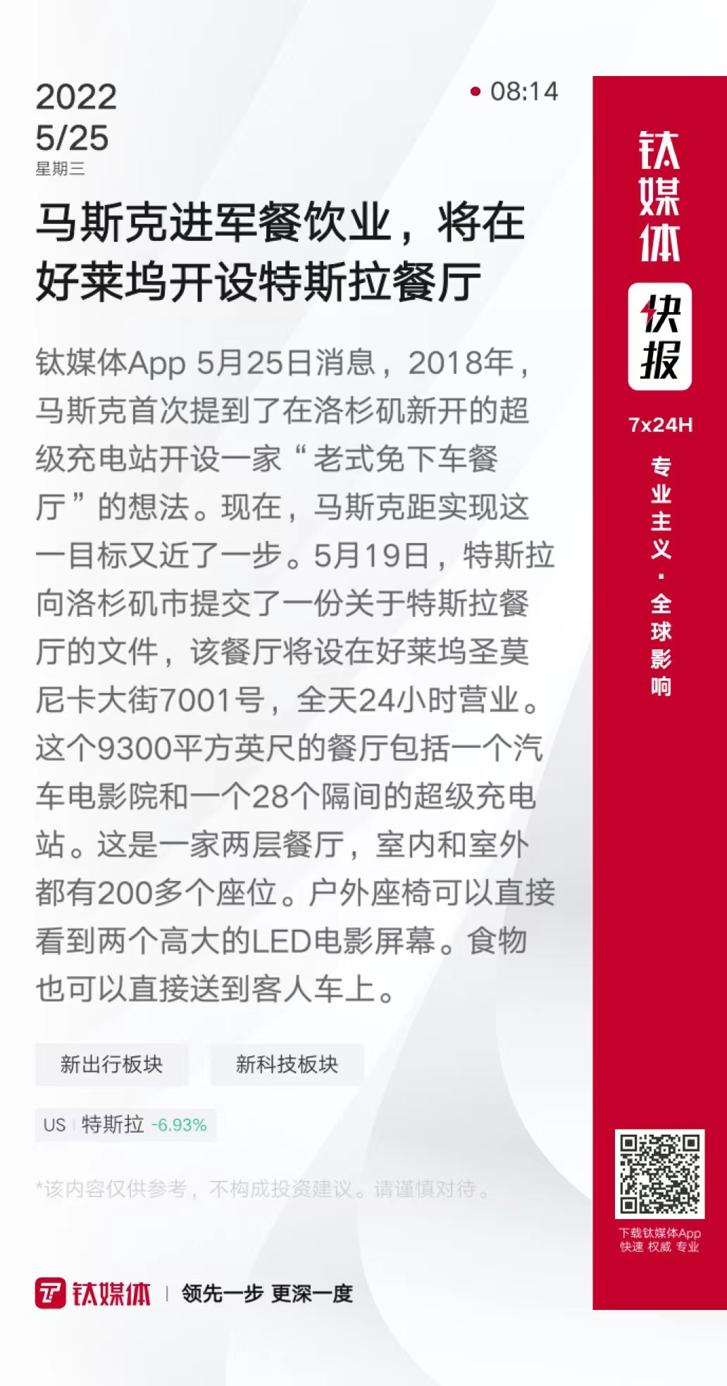 马斯克进军餐饮业,将在好莱坞开设特斯拉餐厅