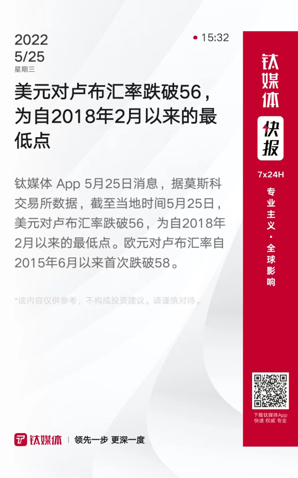 美元对卢布汇率跌破56,为自2018年2月以来的最低点