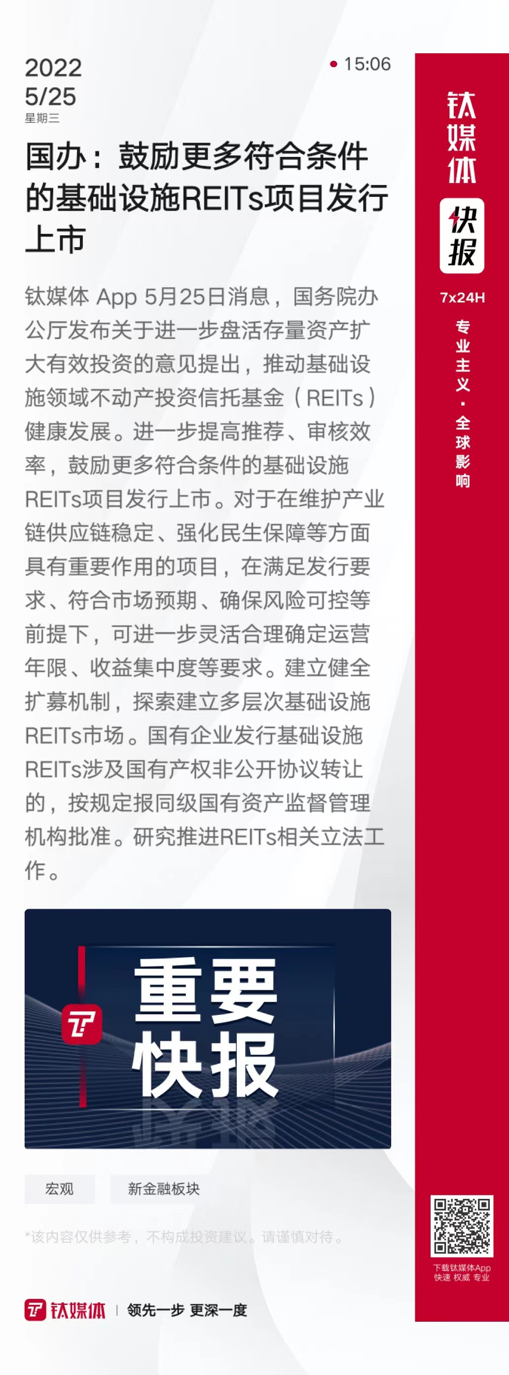 国办:鼓励更多符合条件的基础设施REITs项目发行上市