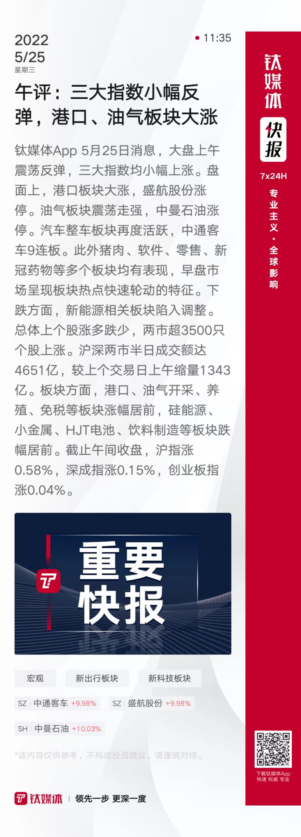 午评:三大指数小幅反弹,港口、油气板块大涨