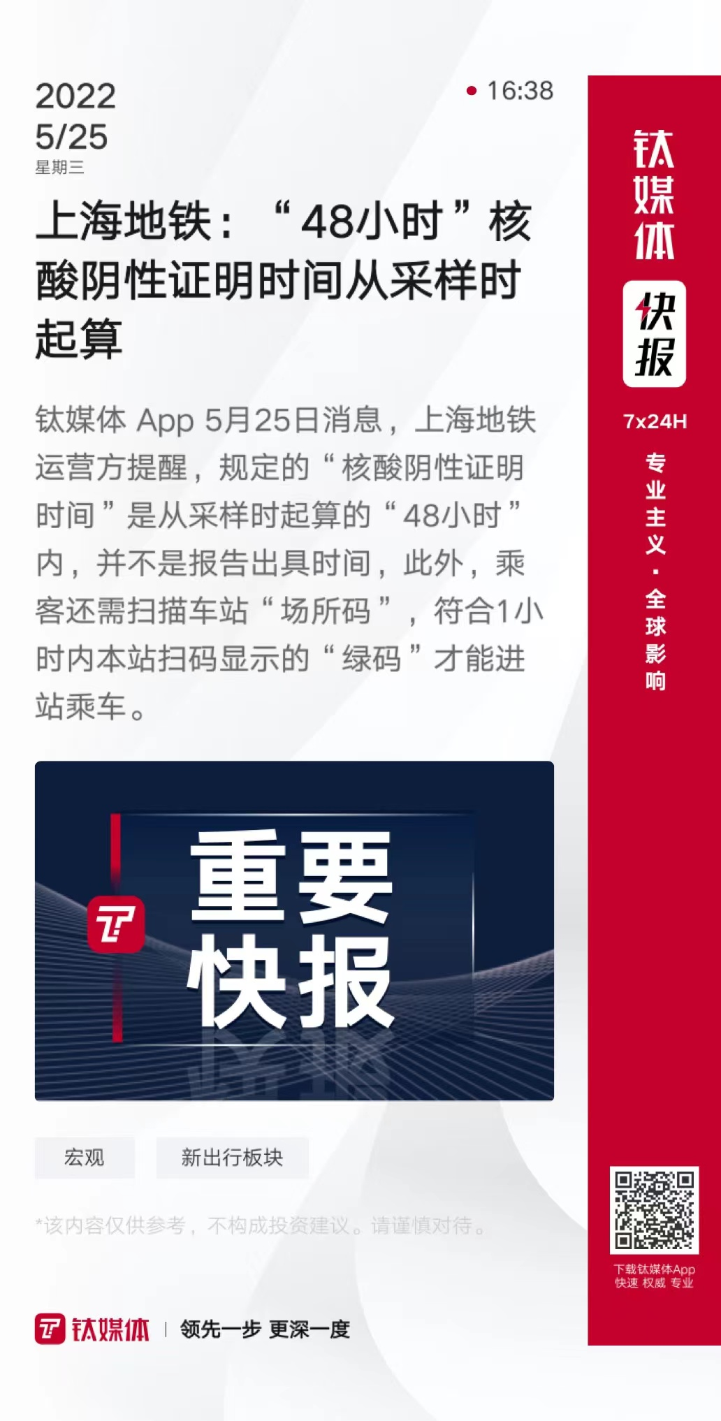 上海地铁:“48小时”核酸阴性证明时间从采样时起算