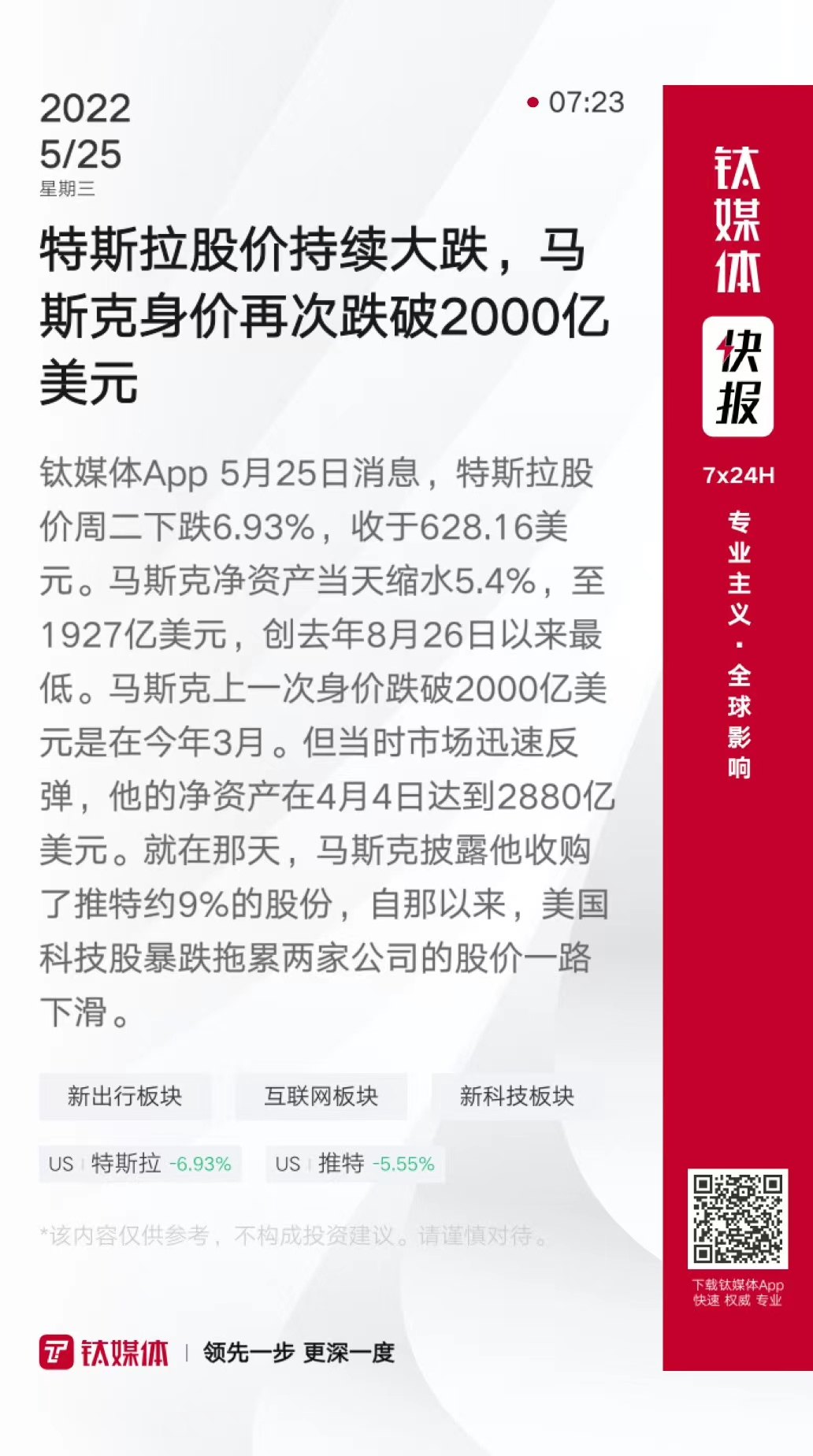 特斯拉股价持续大跌,马斯克身价再次跌破2000亿美元