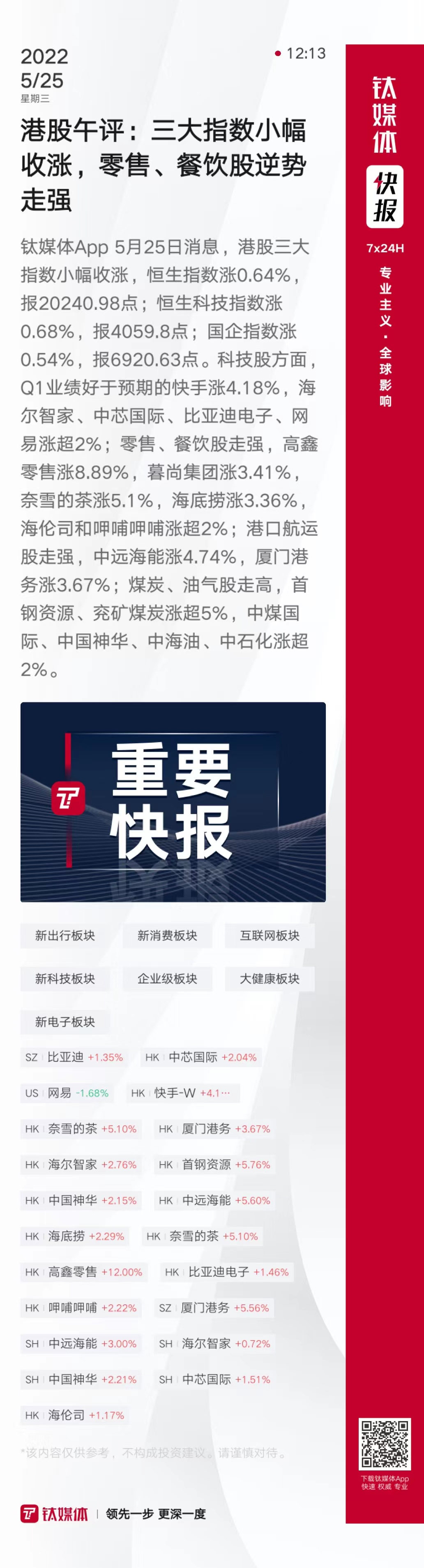 港股午评:三大指数小幅收涨,零售、餐饮股逆势走强