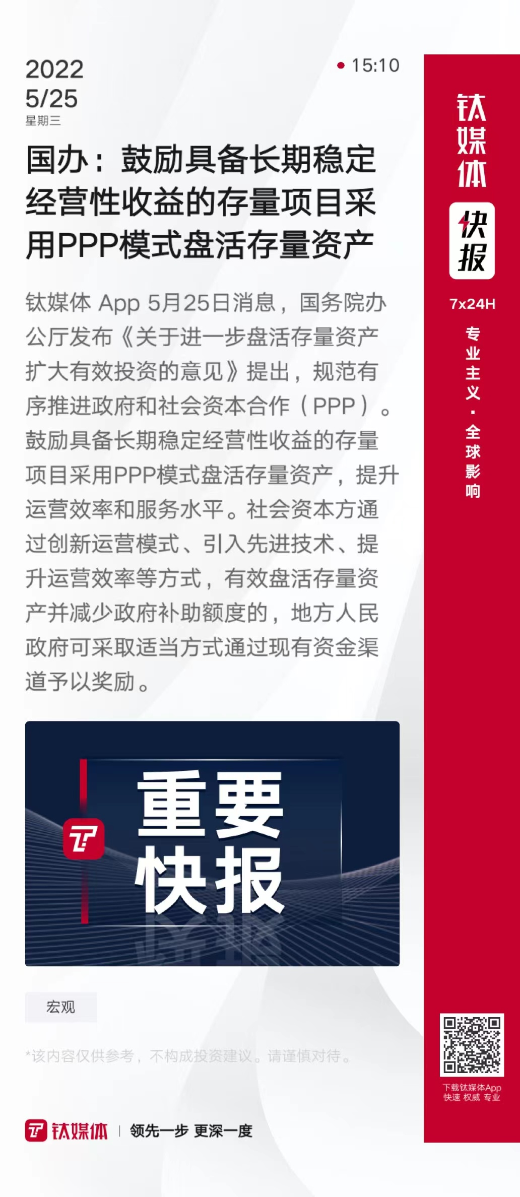 国办:鼓励具备长期稳定经营性收益的存量项目采用PPP模式盘活存量资产