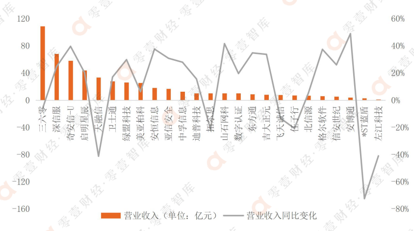 从营业收入同比变化情况来看,25家公司中,三六零的网络安全业务营收增速最快,为70.91%,其次为安博通和山石网科,增速分别为47.89%和41.54%;16家公司的网络安全业务营收增速保持在10%-40%之间;此外,有4家公司的网络安全业务营业收入为负增长,分别是飞天诚信(-13.26%)、任子行(-36.98%)、左江科技(-41.97%)和*ST蓝盾(-71.31%)。