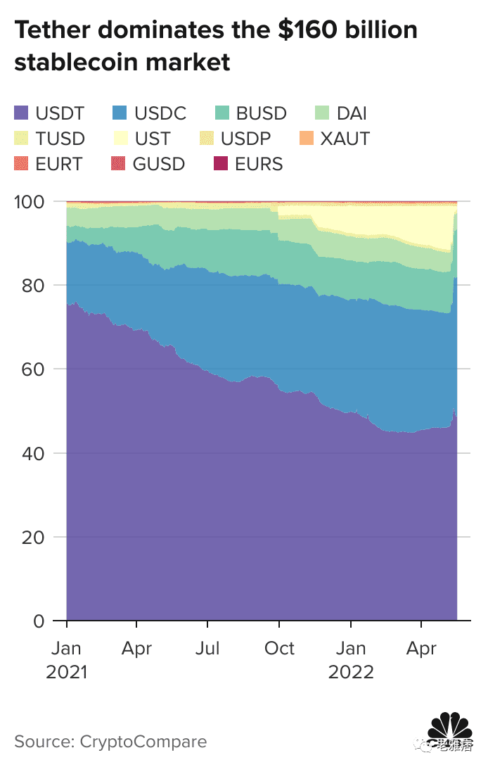 尽管如此,对UST的恐慌已经引起了加密货币市场投资者对其他稳定币--特别是tether的关注。