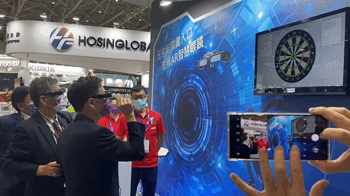 会场中还设置了AR眼镜射飞镖的小游戏,展示佐臻第三代J7EF Plus AR眼镜的新功能,眼镜画面上会显示红色靶心,使用者不需要额外拿遥控器或者佩戴手环,镜头和感测器就会实时应对手势的变化,迅速运算预测轨迹,几乎无延迟地将飞镖射出。