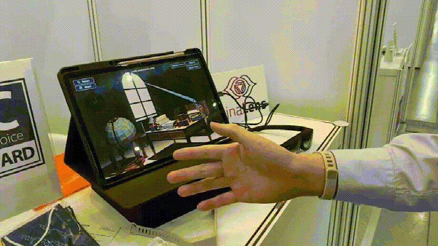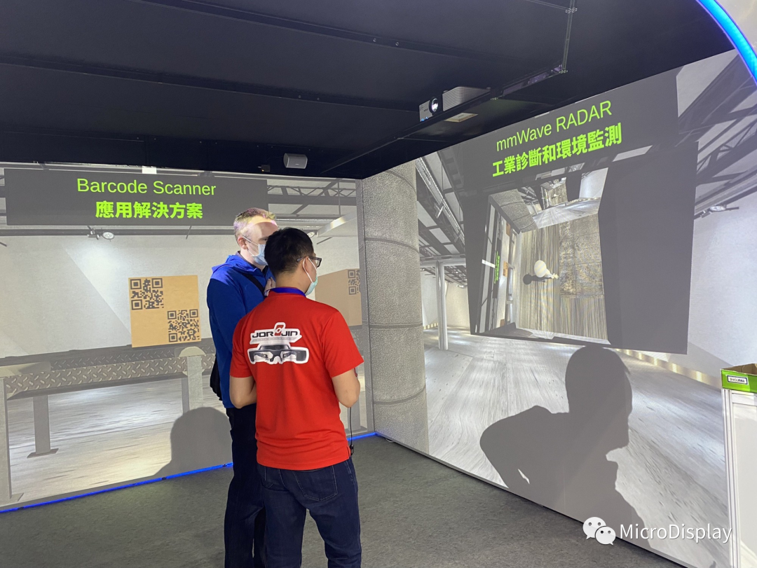 AR眼镜大厂佐臻的摊位就在入口不远处,吸引不少人潮参观,设置了沉浸体验房间,用三面墙投影出工厂、零售货架等应用场景,再搭配自家AR眼镜,呈现佐臻新推出的展演解决方案。例如厂商想向客户Demo巨大的机械产品,不需要搬移到现场,可以利用投影加上AR眼镜呈现解说,甚至能和画面中的产品互动。