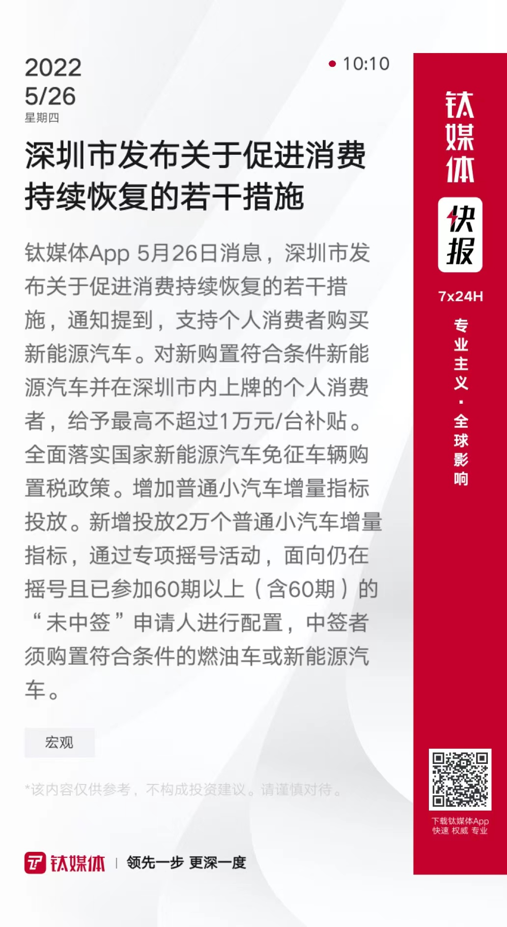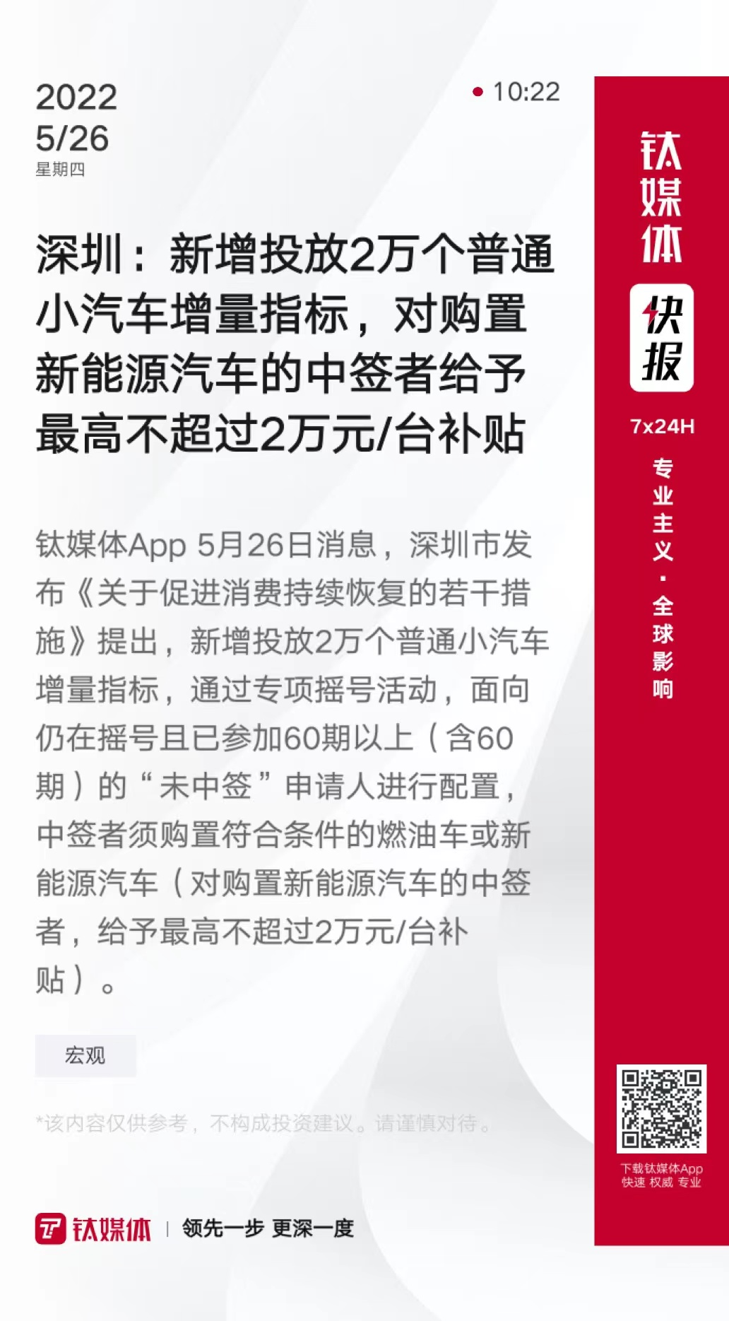 深圳:新增投放2万个普通小汽车增量指标,对购置新能源汽车的中签者给予最高不超过2万元/台补贴