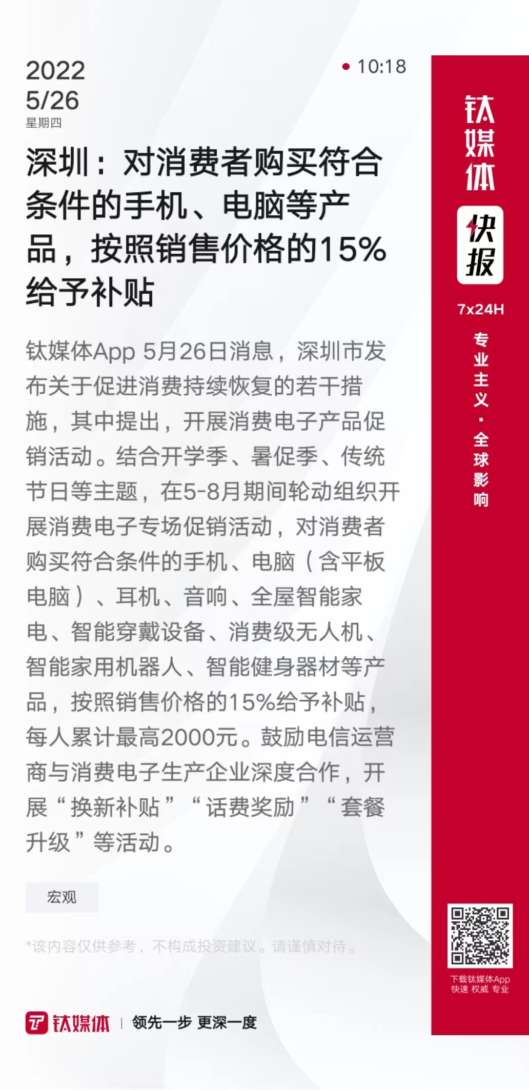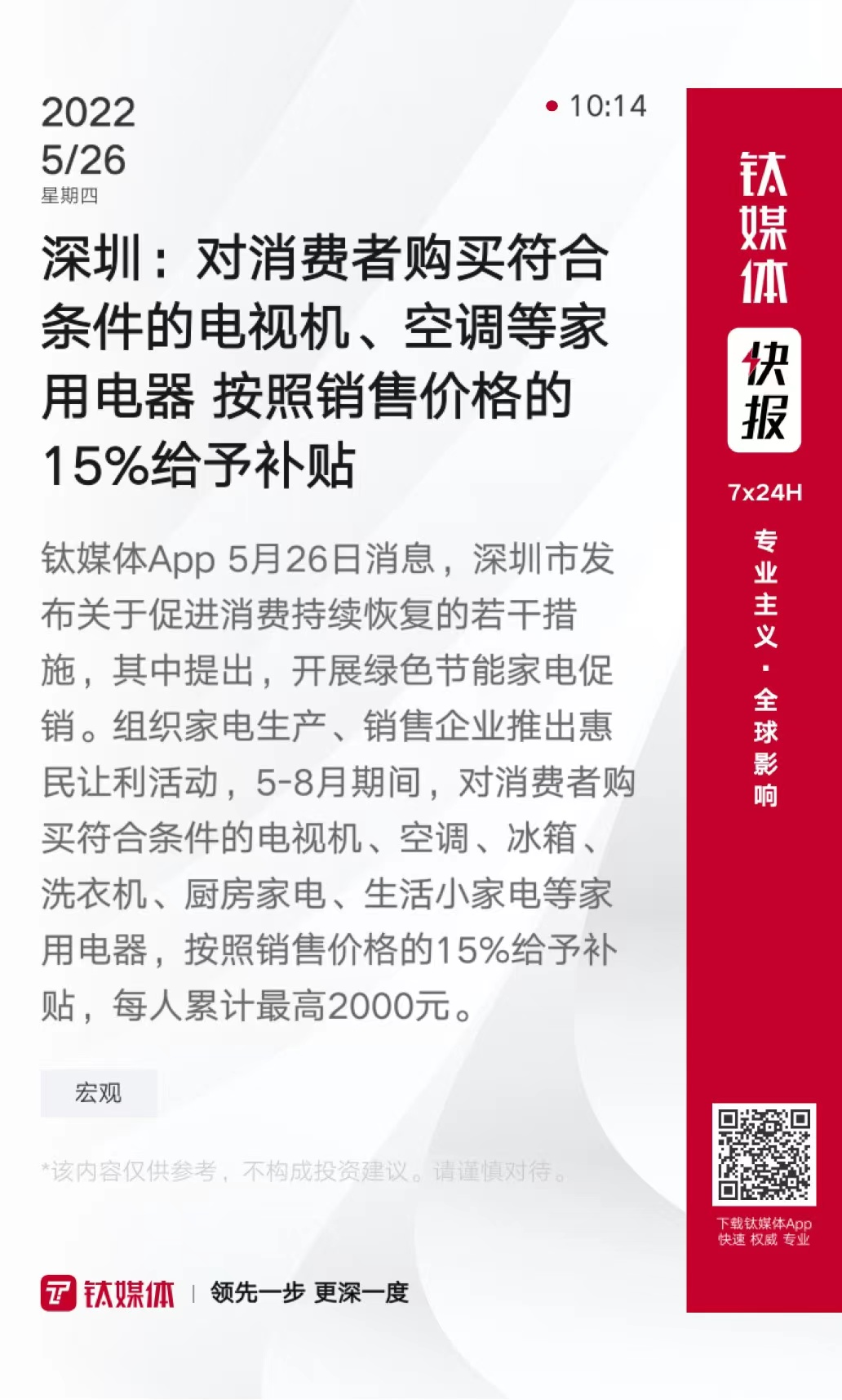 深圳:对消费者购买符合条件的电视机、空调等家用电器 按照销售价格的15%给予补贴