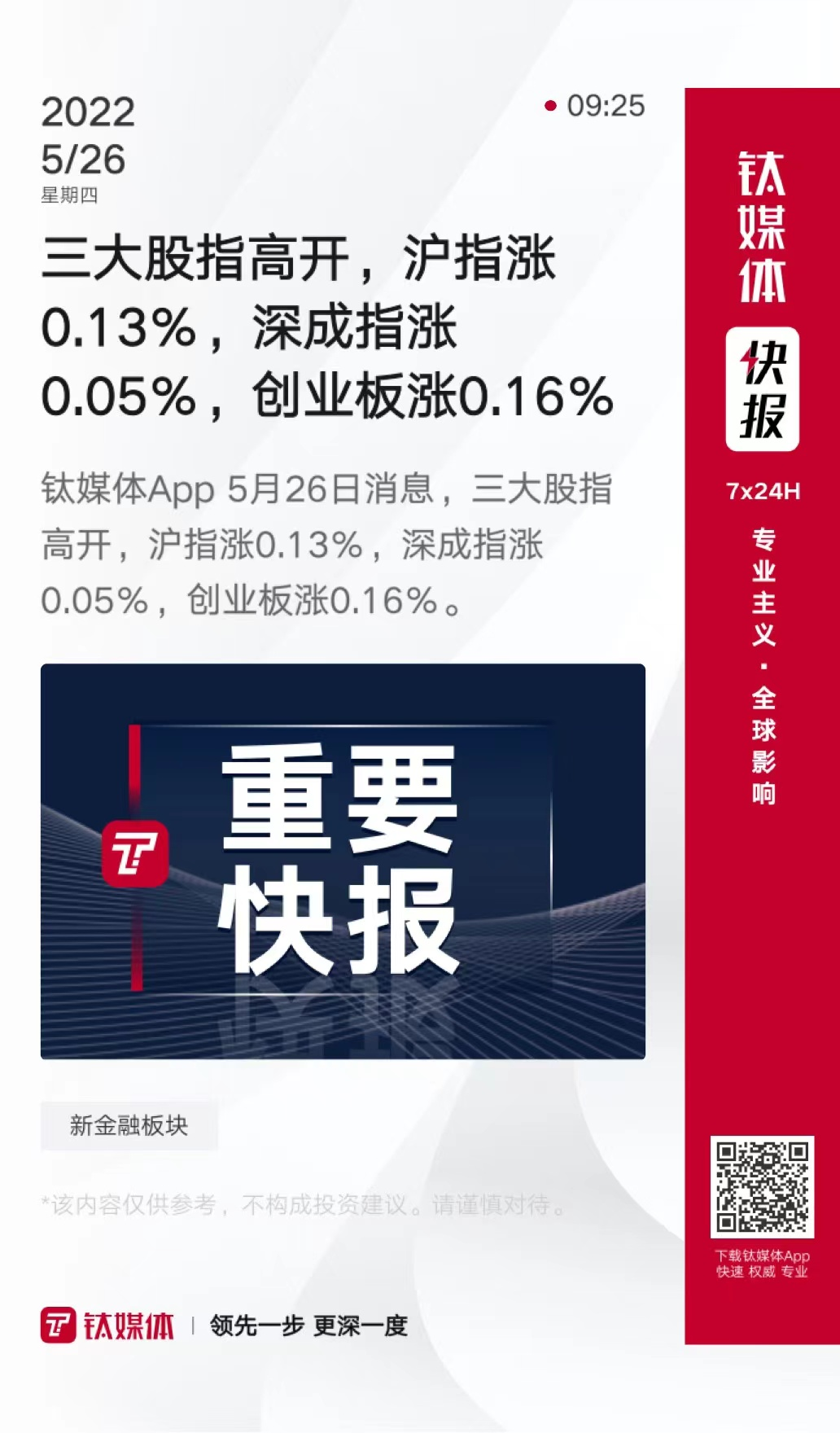 三大股指高开,沪指涨0.13%,深成指涨0.05%,创业板涨0.16%