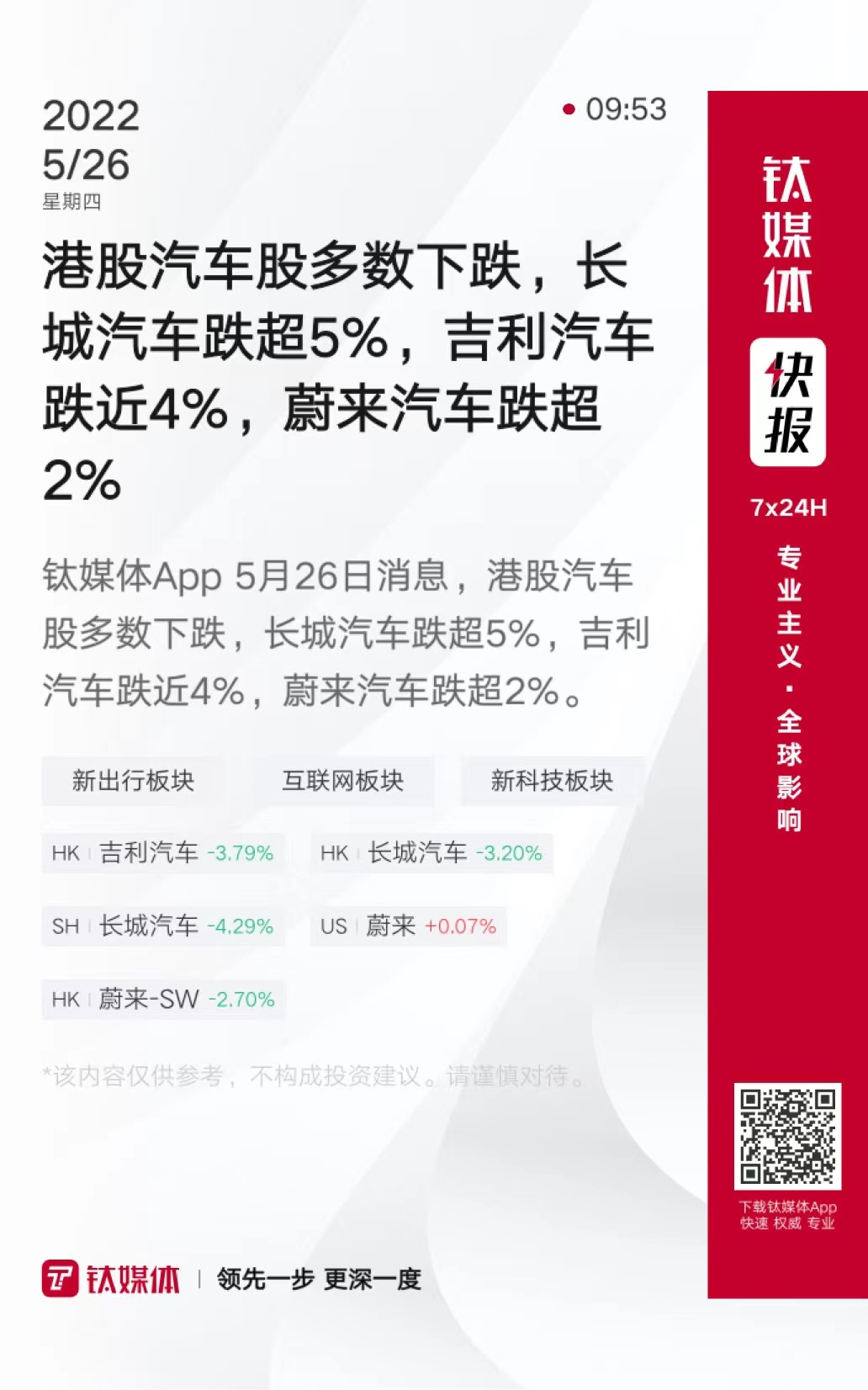港股汽车股多数下跌,长城汽车跌超5%,吉利汽车跌近4%,蔚来汽车跌超2%