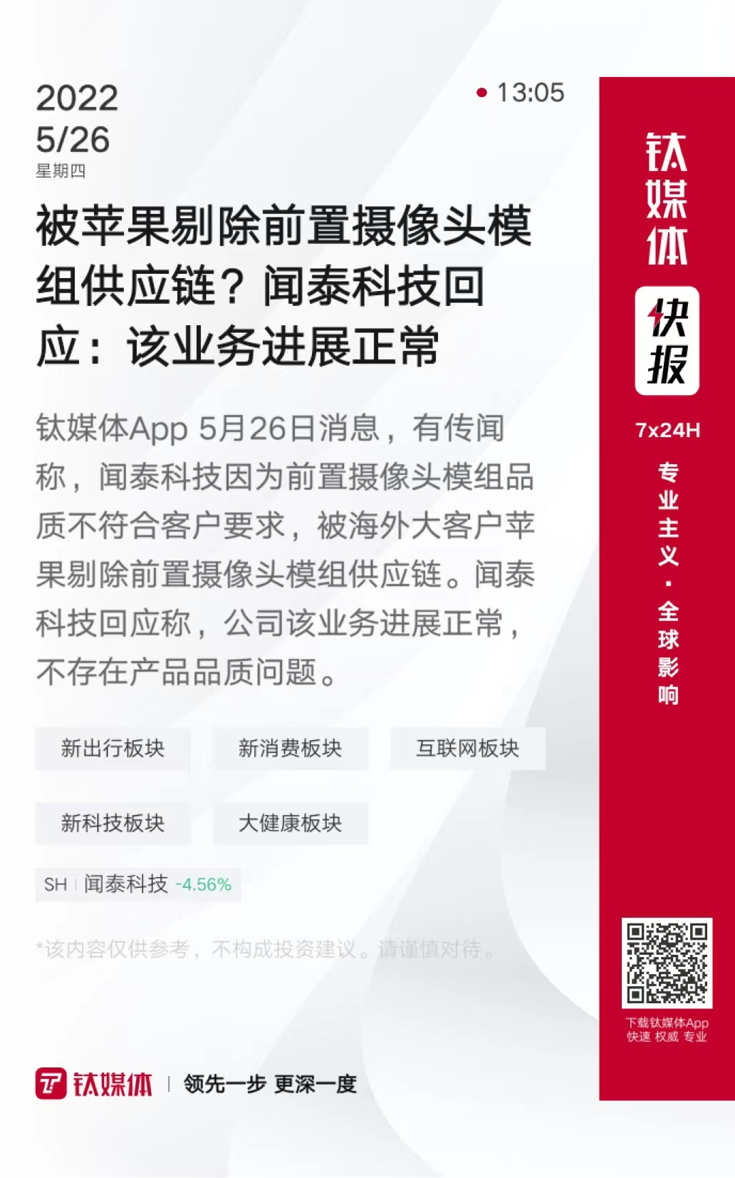 被苹果剔除前置摄像头模组供应链?闻泰科技回应:该业务进展正常