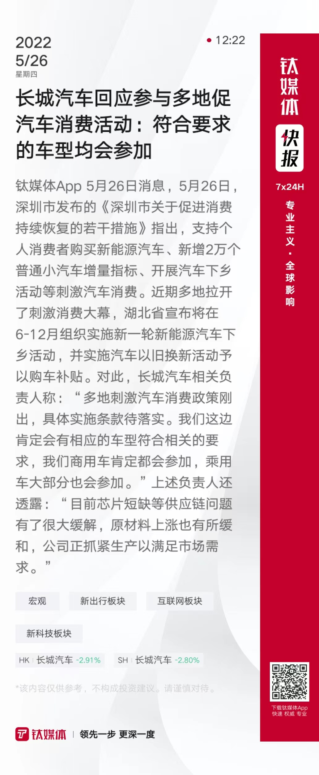 长城汽车回应参与多地促汽车消费活动:符合要求的车型均会参加
