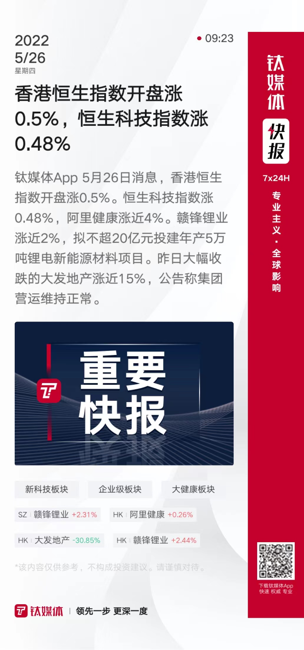 香港恒生指数开盘涨0.5%,恒生科技指数涨0.48%