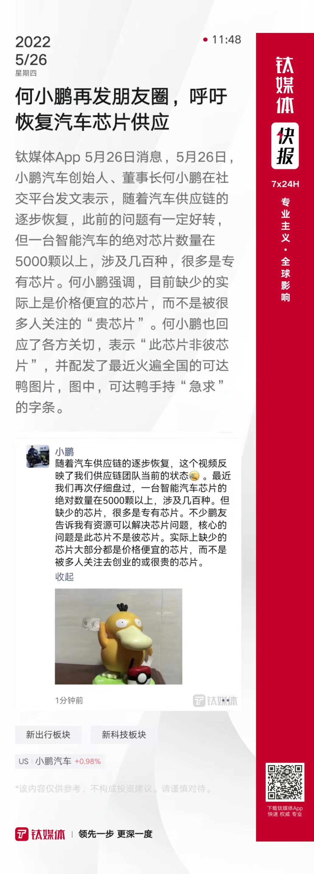 何小鹏再发朋友圈,呼吁恢复汽车芯片供应