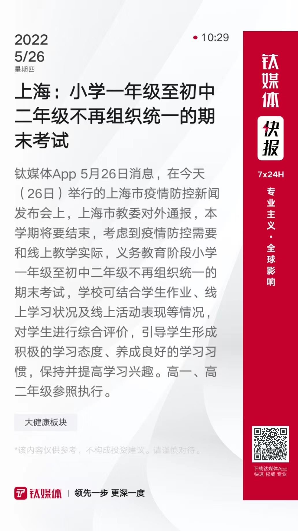 上海:小学一年级至初中二年级不再组织统一的期末考试