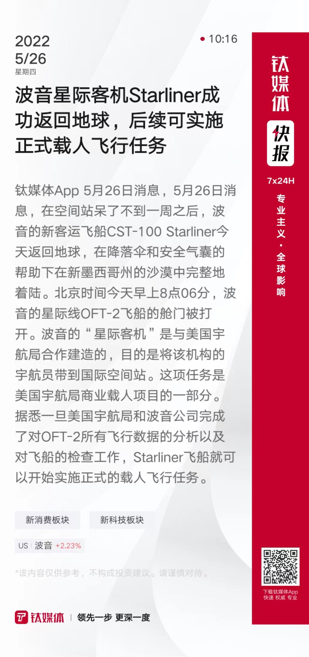 波音星际客机Starliner成功返回地球,后续可实施正式载人飞行任务