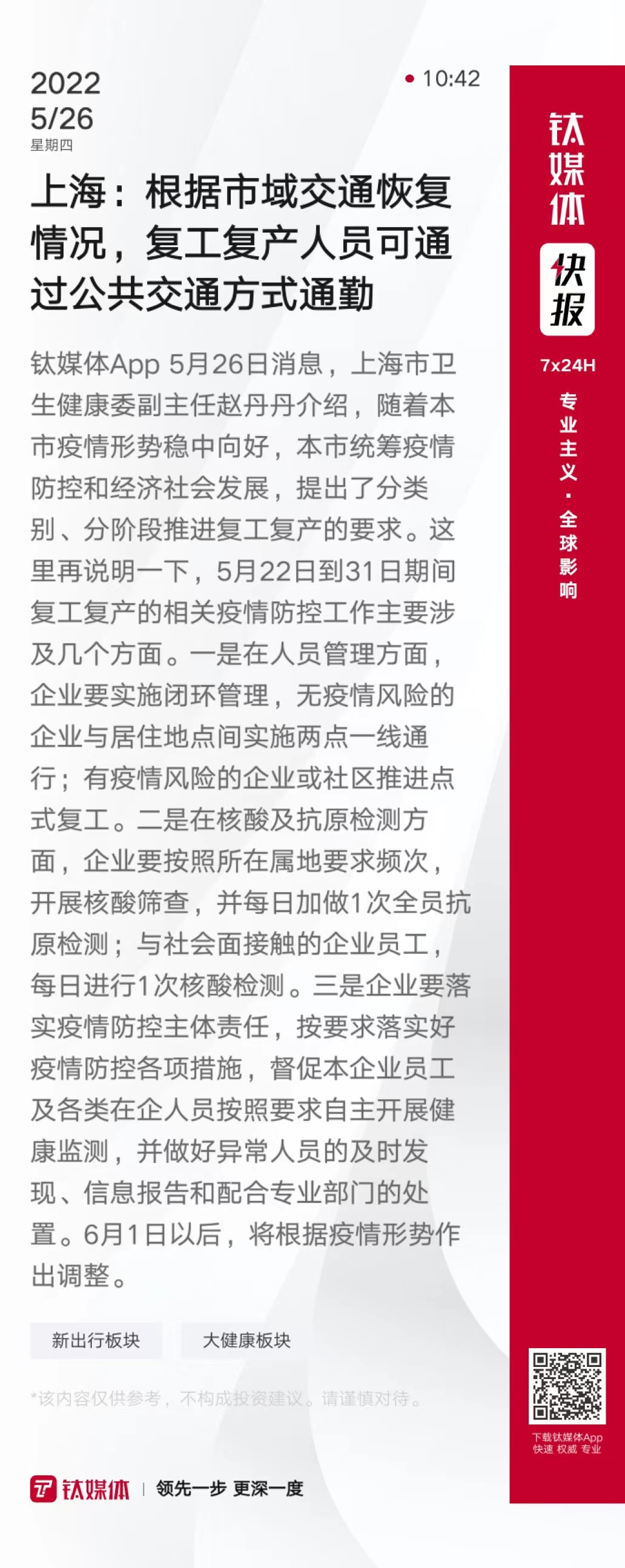 上海:根据市域交通恢复情况,复工复产人员可通过公共交通方式通勤