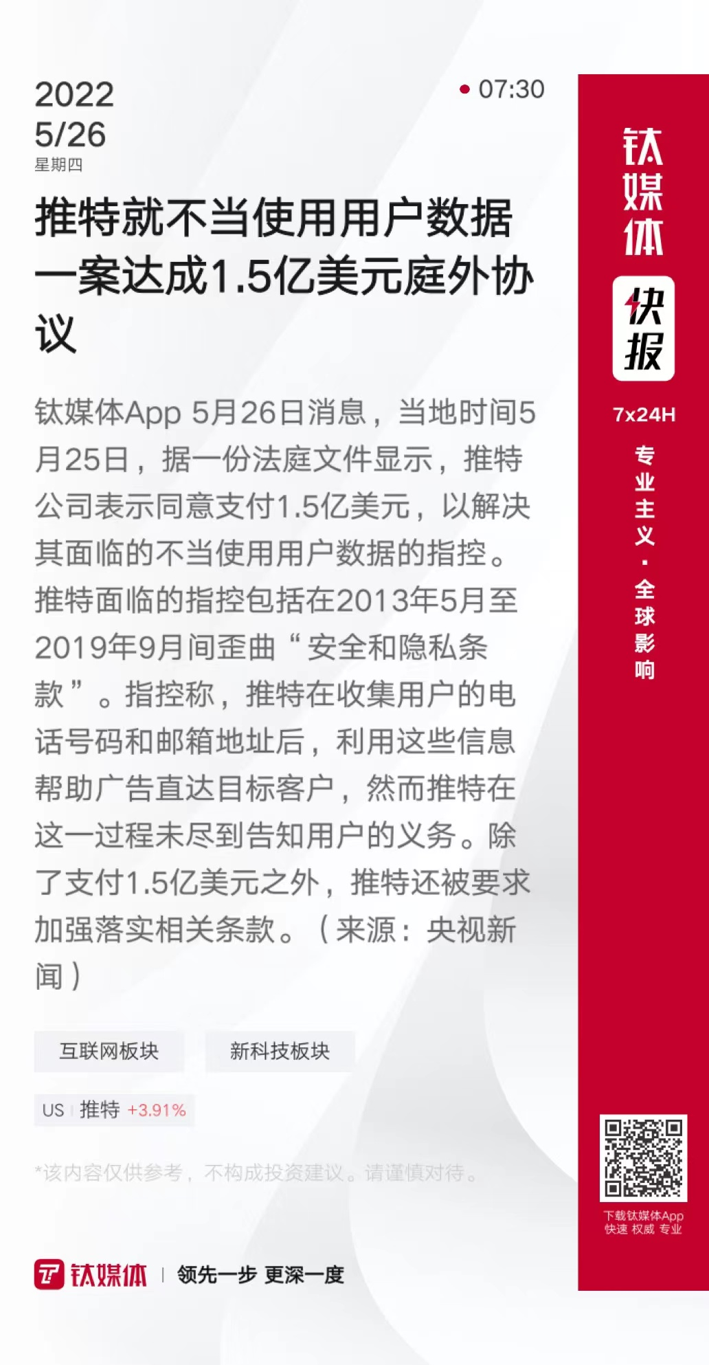 推特就不当使用用户数据一案达成1.5亿美元庭外协议