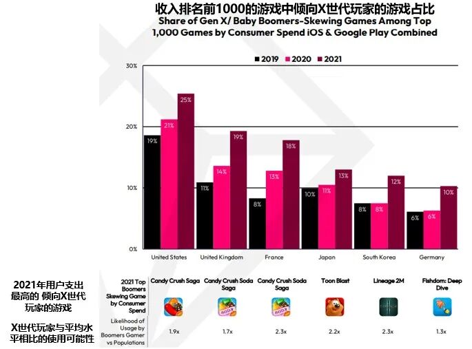 当然,X世代和婴儿潮一代(45 岁)也不容忽视,这是美国移动游戏市场中支出增长最快的用户群,其游戏支出从2019年开始,每年都保持着6%的同比增长。实际上,这一玩家群体可能是美国最富有的玩家群——他们掌控着80%的财富。