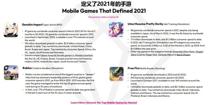 在游戏部分,如果要用4款游戏来定义2021年的游戏市场,那么将会是《原神》、《赛马娘》、《Roblox》和《Free Fire》。在2022年,核心游戏将依然占据主导地位,尤其是那些具有在线服务功能的游戏将成为最受玩家欢迎的,例如《原神》、《王者荣耀》、《和平精英》、《Roblox》等。