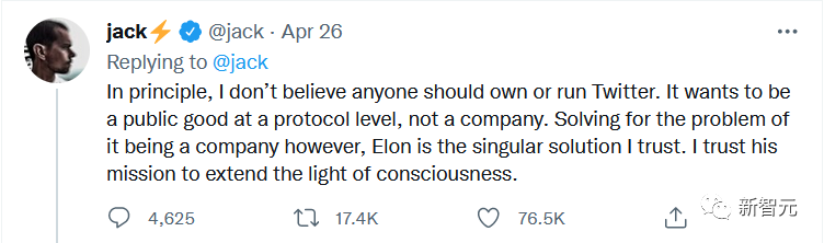 早在2020年初的一次员工大会上,推特的联合创始人兼首席执行官杰克·多西邀请了一位明星嘉宾向他的员工讲话——他就是马斯克。这位特斯拉首席执行官通过视频向听众抱怨,推特平台上垃圾机器人泛滥。当然,他现在也用这个问题来搪塞这家社交媒体提出的440亿美元报价。除了马斯克对虚假账户的持续痴迷,这次的收购似乎也证明了马斯克和多西之间的密切关系。这种亿万富翁的「兄弟情」已经极大地撼动了推特的未来。包括,员工因招聘冻结、成本削减、士气低落,以及马斯克的多次嘲讽而产生的愤怒之情。在4月初马斯克首次被邀请作为大股东加入推特董事会后,多西就曾表示,「如果推特是一家私营的公司,才能在执行方面做得更好」。在随后的4月26日,多西再次发文称,「不应由单个人拥有推特,推特应该在基础协议层面上是个公共品,而非私家公司」。免责声明发布之后,多西马上用溢美之词夸赞怒砸巨资、来势汹汹要买下推特的马斯克:「但如果要解决推特作为公司的弊病的话,伊隆哥是我唯一信赖的解决选项。我相信他将延续这一言论良心之光的使命感。」而且,他还在推文上附了Radiohead乐队的名曲《各得其所》(Everything In Its Right Place)。此外,这两个人在抨击董事会对内容审核的决定,以及网站上虚假账户的数量上,意见也出奇的一致。毕竟董事会曾给多西施压,要求他去解决重大的内容审核问题,比如封了美国前总统特朗普的账号,而多西并不愿意这样做。当然,除了对Twitter的共同兴趣之外,这两位企业家在加密币、开源技术和言论自由等话题上也找到了不少的共同点。这么看来,多西或许从第一天起就是「马斯克团队」的一员了。