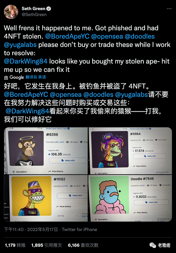 与此同时,Seth Green在他的段子中透露,他有计划发布一个名为白马酒馆的项目。这位明星持有无聊猿#8398。不幸的是,Green说这个作品,以及其他三个高价值的NFT--两个变异猿和一个Doodle--在最近的一次网络钓鱼攻击中被盗。
