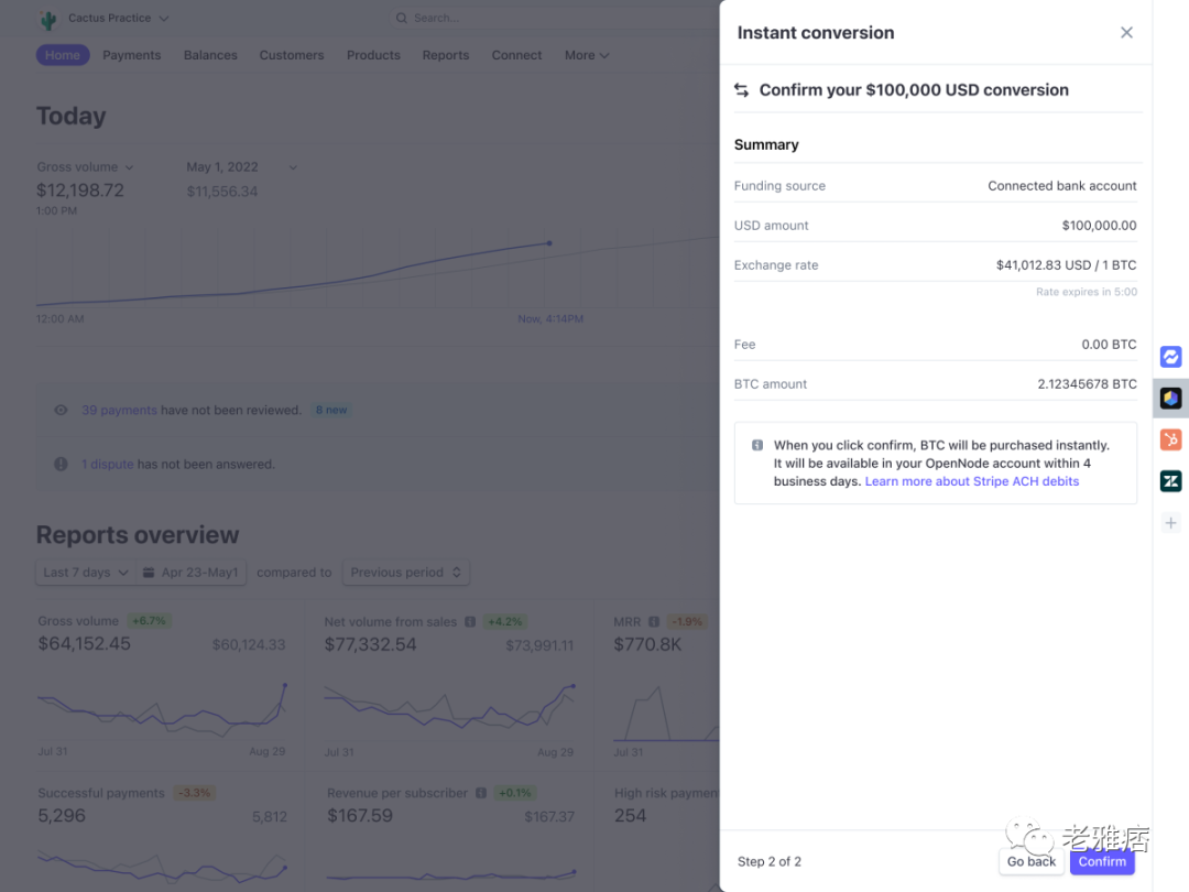 通过位于Stripe应用市场的OpenNode应用,用户将能够把法币支付实时转换为比特币。企业可以设置自动将其支付的金额转换为比特币,或者他们将能够手动将任何金额转换为比特币。