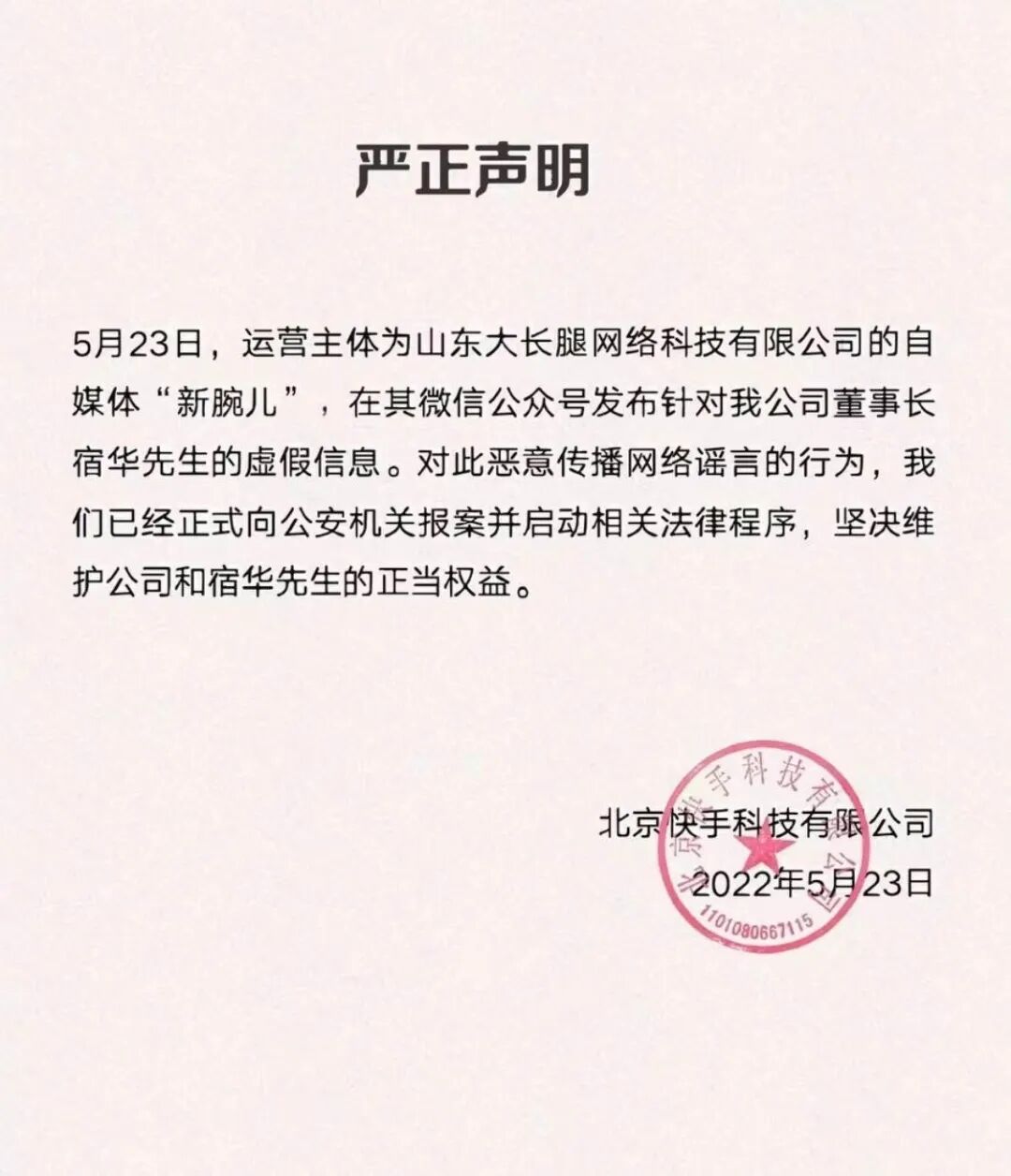 对此,宿华本人回复称,不信谣不传谣。快手随后发布官方声明称,对此恶意传播网络谣言的行为,已经正式向公安机关报案并启动相关法律程序,坚决维护公司和宿华先生的正当权益。