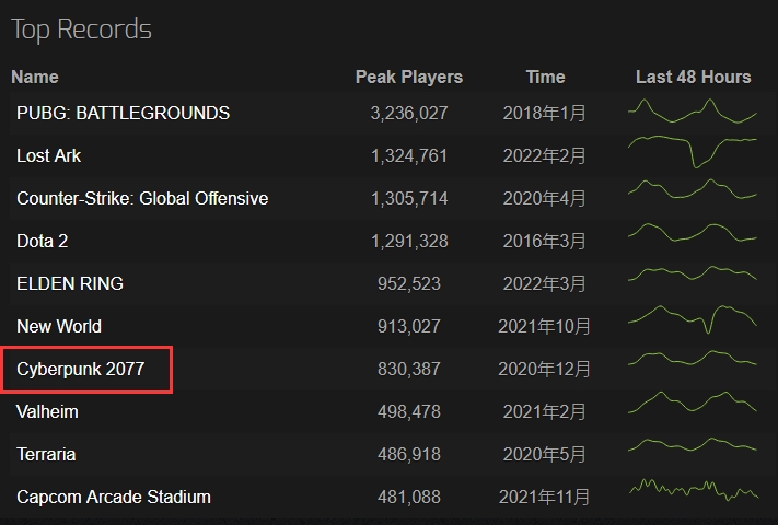 财报相比去年同期能这么好看,主要原因还是《赛博朋克2077》这个曾让玩家恨铁不成钢的游戏最近又“支棱”起来了——在今年第一季度,2077已经长期位居Steam在线人数榜单前十。