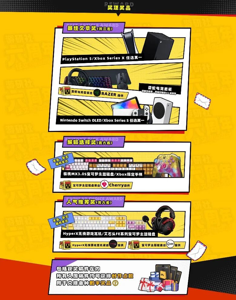 其中最优秀、最受欢迎的作品,奖品与福利也是少不了的。本次比赛,我们设立有三名【最佳文章奖】,大奖奖品包含“御三家主机”任选、雷蛇键鼠套装等,还有多名【编辑选择奖】与【人气推荐奖】等待你来角逐: