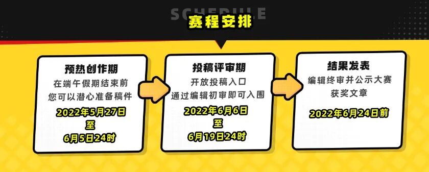另外,为了给所有参赛者更充裕的时间,我们还加入了一段【预热创作期】。从即日起到6月6日,投稿入口暂不开放,你可以先在本地创作稿件,而不用着急投递,正好利用即将到来的端午佳节,构思你的大作。