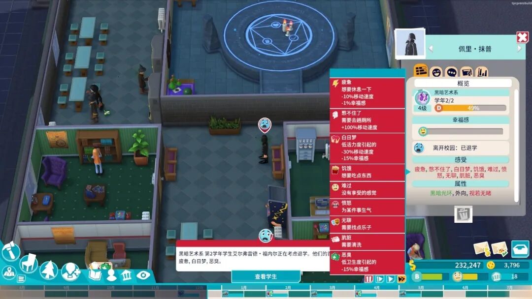 总之,《双点校园》的玩法核心,由原先的科室建设,转向了照顾学生。前作的病人都是爱治不治,只要别擅自死在走廊上就好。现在,每个在校大学生都精贵得很,退学一个就少一份学费。一学期总共也没几十个学生,不想破产就得伺候着点。
