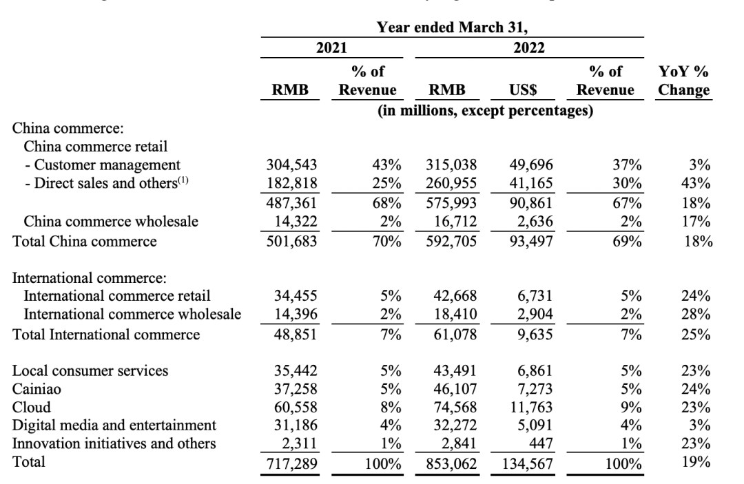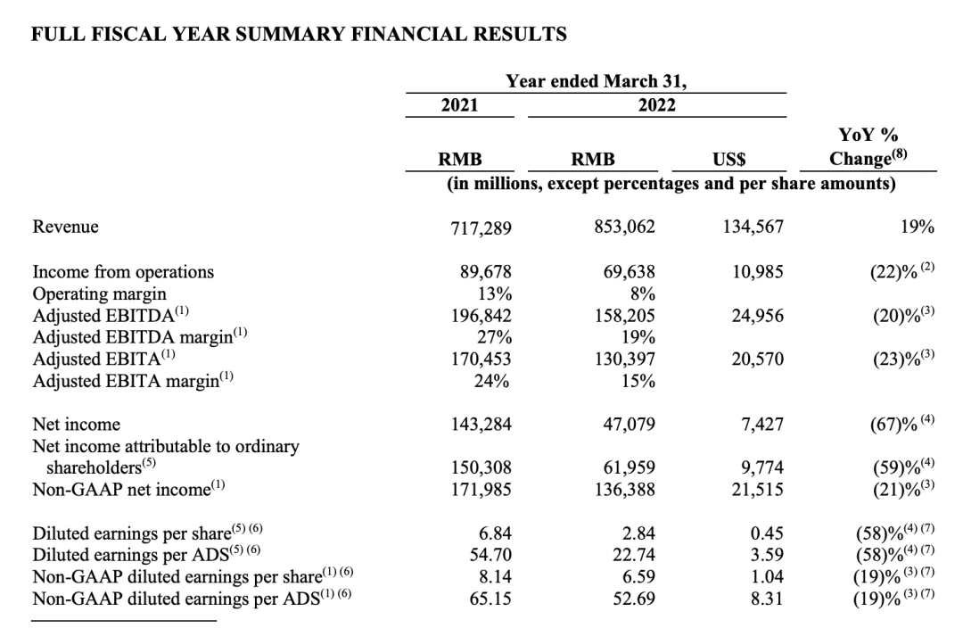 全年来看,在2022财年阿里巴巴总收入为收入为人民币8530.62亿元(1345.67 亿美元),同比增长19%;归属于普通股股东的净利润为人民币619.59亿元(97.74亿美元),同比下降59%,不按美国通用会计准则计算,净利润为人民币1363.88亿元(215.15亿美元),同比下降21%。财报中提到,截至2022年3月31日,阿里巴巴集团全球年度活跃消费者达到约13.1亿,比上个财季增加了2830万。其中包括中国消费者超过10亿,以及海外消费者3.05亿,主要来自来自Lazada、速卖通、Trendyol、Daraz等国际零售业务。根据业务划分,2022财年阿里云业务总收入在抵销跨分部交易前和抵销后分别为1001.8亿元和745.68亿元,同比增长分别21%和23%;菜鸟2022财年收入668.08亿元,同比增长27%,占营业收入69%;2022财年来自中国商业零售业务的“直销及其他”收入为725.26亿元人民币,较2021年同期的637.97亿元人民币增长14%,主要是由于盒马鲜生、天猫超市等直销业务贡献的收入;来自数字媒体及娱乐分部的收入为80亿元,同比下降1%;来自创新业务及其他分部的收入为3.84亿元,同比下降35%。财报发布后,阿里巴巴集团董事局主席、CEO张勇,执行副董事长蔡崇信及CFO徐宏出席了随后召开的电话会议,对财报进行了解读,并回答了分析师提问。在电话会议中徐宏披露,过去一年,阿里巴巴技术投入超过1200亿元人民币,这一数字3年来一直在稳步增长。未来将在科技、创新密集领域继续坚定投入。技术投入是衡量企业创新力的关键指标。据了解,目前,阿里巴巴在全球设立了七个研究中心,布局超过16个底层技术领域,向全社会开源技术项目超3000个,累计在战略性新兴产业获全球发明专利授权超1万件。![]()