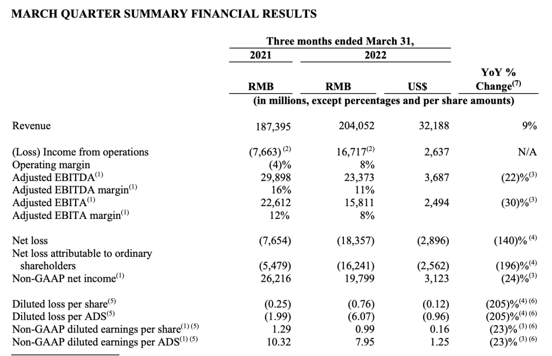 昨日晚间,阿里巴巴发布了截至2022年3月31日的2022财年第四季度及全年财报。财报显示,该公司第四季度营收为人民币2040.5亿元(321.88亿美元),同比增长9%。归属于普通股股东的净亏损为人民币162.41亿元(25.62亿美元)。不按美国通用会计准则计算,净利润为人民币197.99亿元(31.23亿美元),同比下降24%。