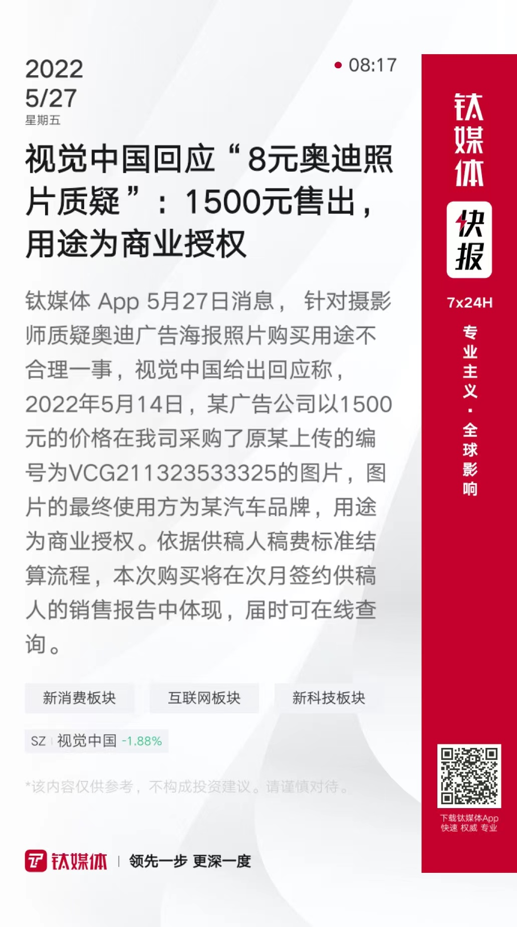 视觉中国回应“8元奥迪照片质疑”:1500元售出,用途为商业授权