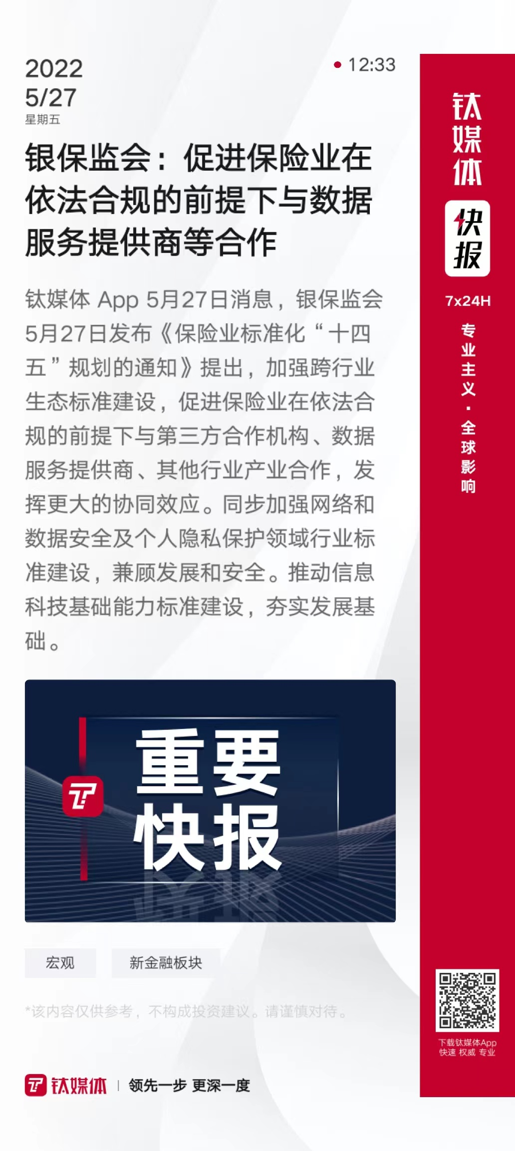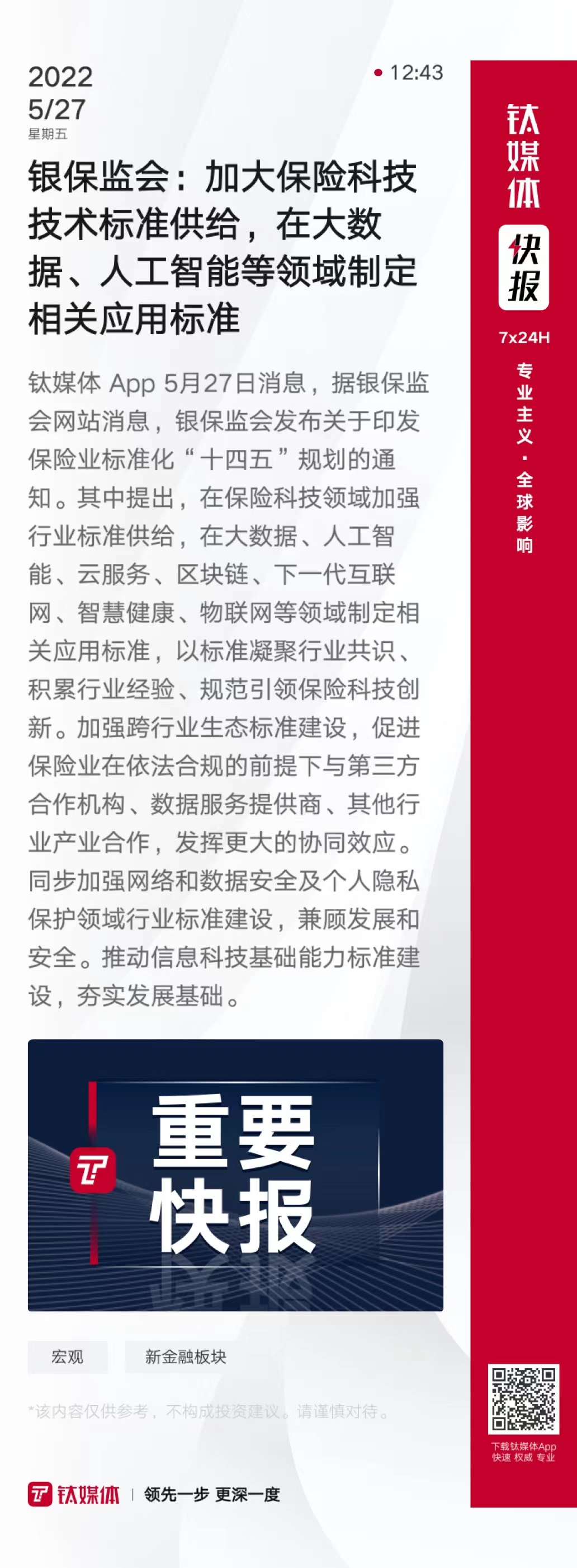 银保监会:加大保险科技技术标准供给,在大数据、人工智能等领域制定相关应用标准