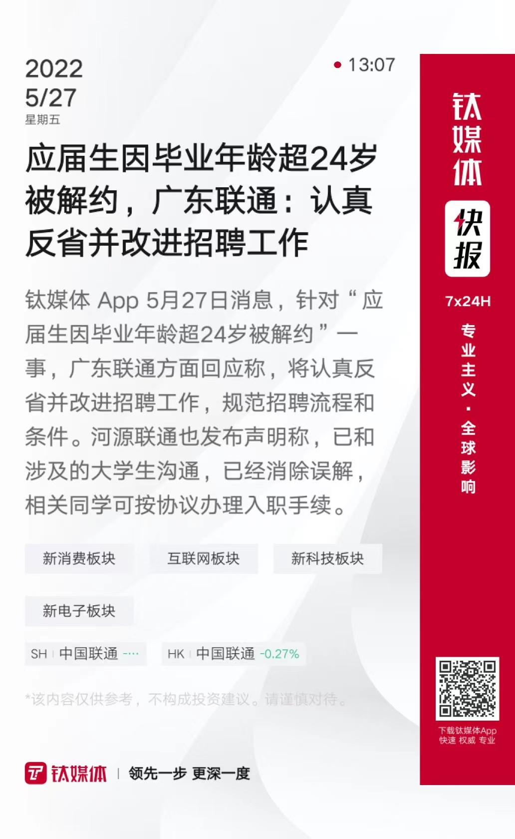应届生因毕业年龄超24岁被解约,广东联通:认真反省并改进招聘工作