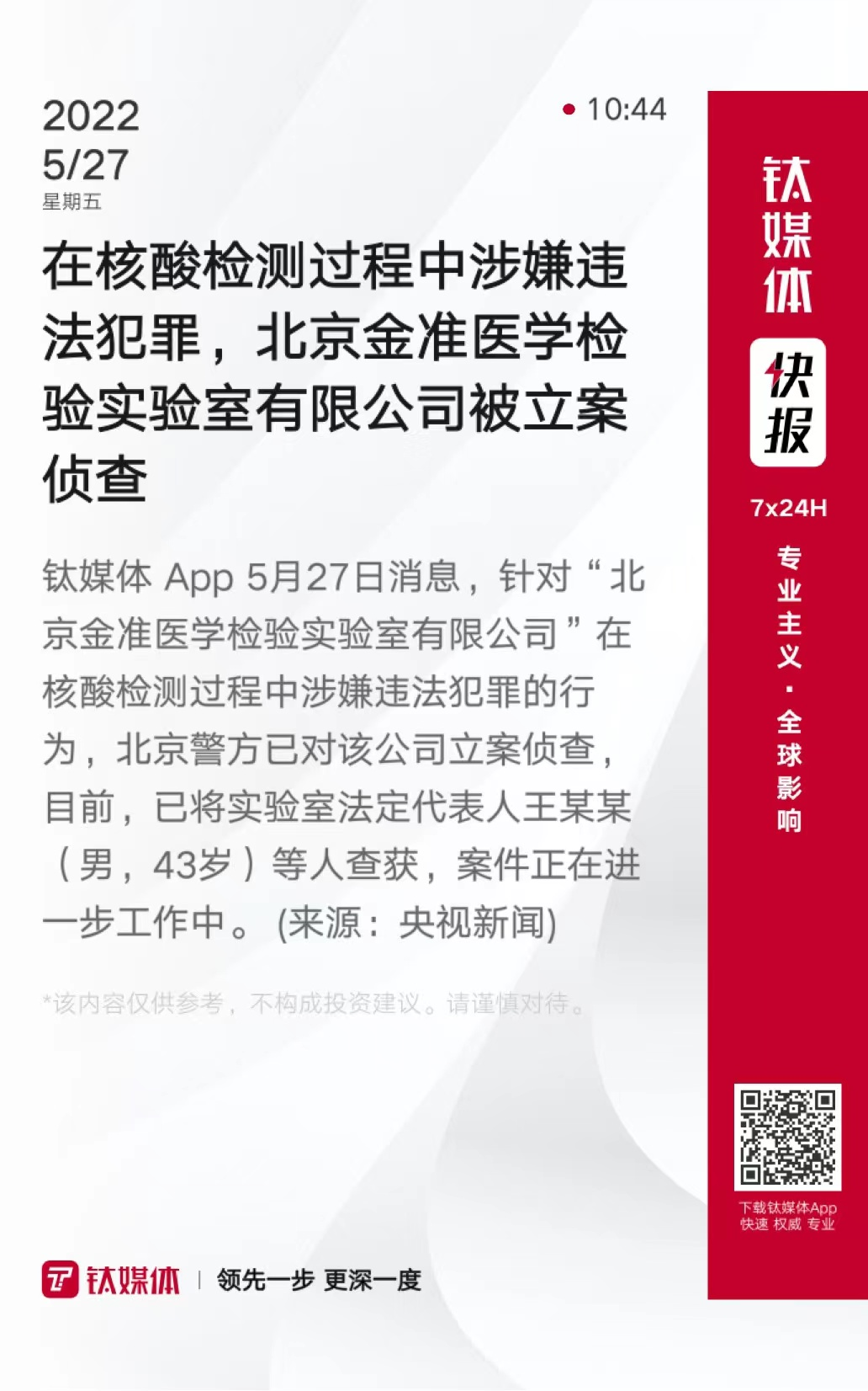 在核酸检测过程中涉嫌违法犯罪,北京金准医学检验实验室有限公司被立案侦查